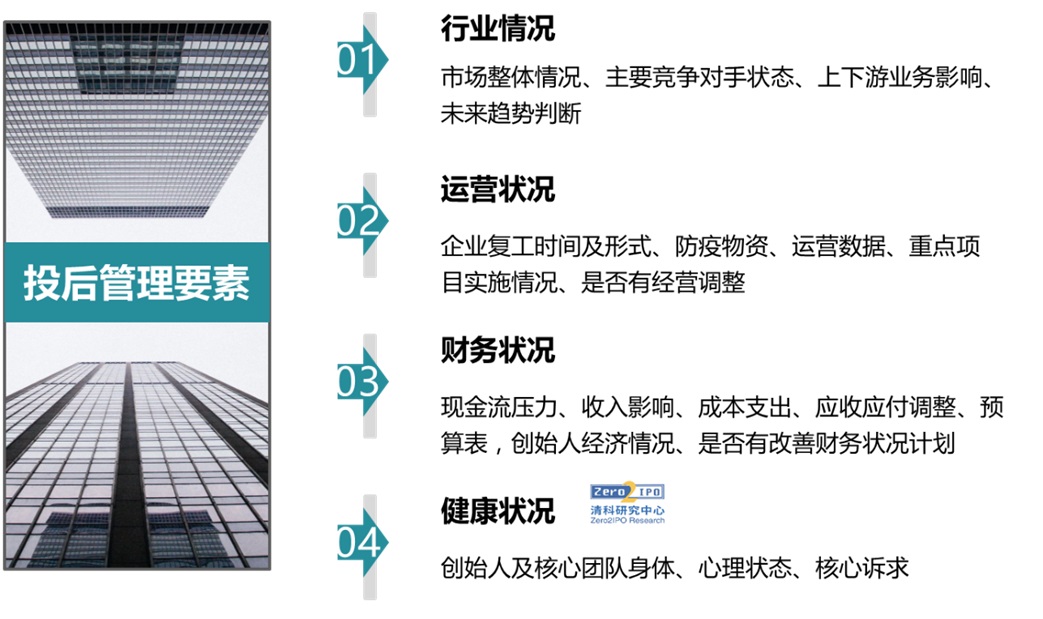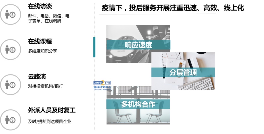 在嚴(yán)格的物理隔離之下,機構(gòu)投后服務(wù)開展注重高效化、線上化。通過在線訪談、電子表單等形式收集被投企業(yè)信息;通過線上課程解答眾多創(chuàng)業(yè)企業(yè)需要面對的共性問題;原本線下進行的資源對接會、路演也轉(zhuǎn)為了“云路演”,為企業(yè)高效對接資源。針對有外派人員的并購類、工程類項目,外派人員及時甚至提前到崗,加快企業(yè)安全復(fù)工復(fù)產(chǎn)。