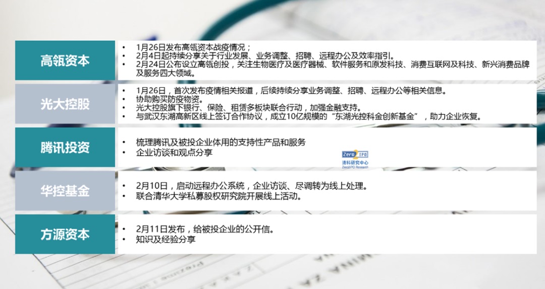 VC機構(gòu)是投后服務(wù)體系較為健全的一類。面對突發(fā)狀況,VC機構(gòu)投后服務(wù)啟動迅速,例如1月26日,紅杉中國即發(fā)布了《紅杉中國給成員企業(yè)的一封信》,發(fā)出對被投企業(yè)的三個提醒。紅杉、源碼資本、GGV等機構(gòu)均迅速開展了系列課程,涵蓋遠程辦公協(xié)作、勞動法規(guī)培訓(xùn)、疫情時期的融資策略、疫情期間的財務(wù)風(fēng)險管理以及疫情時期的人力資源優(yōu)化等方面。紅杉、經(jīng)緯、BAI率先嘗試了線上路演形式;紅杉、深創(chuàng)投、源碼資本幫助企業(yè)解決春招難題。